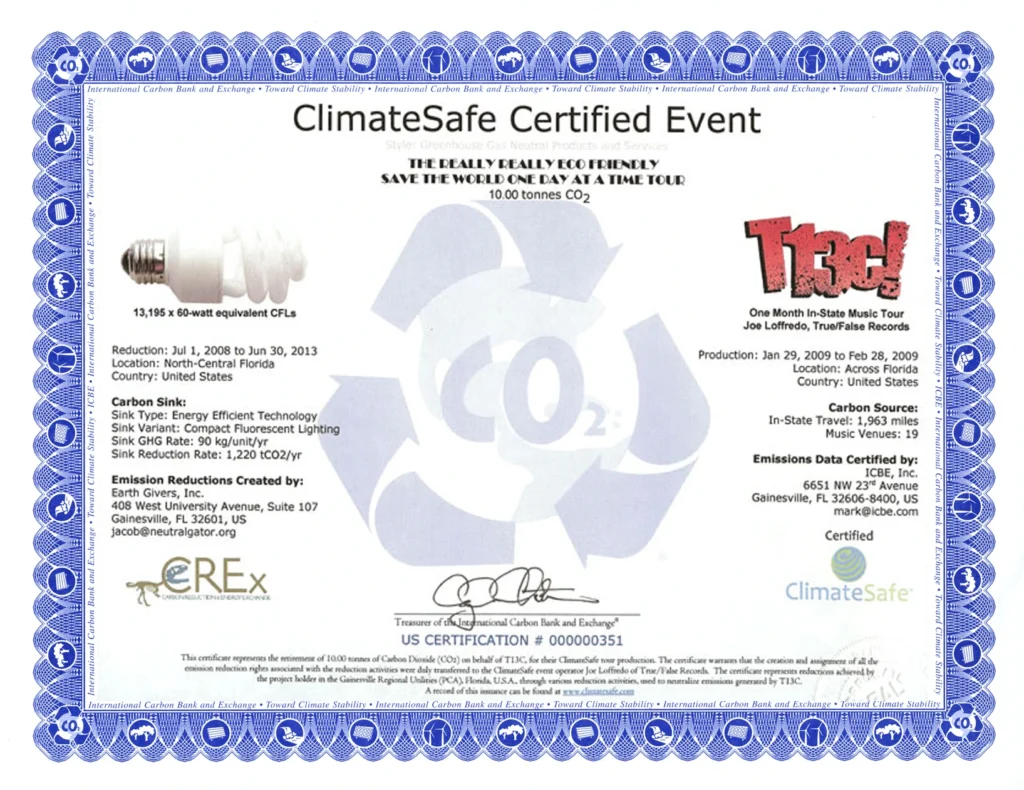 Gainesville-based band T13C teamed up with CREX. This initiative through the non-profit Earth Givers provided carbon offsetting options to the arts in order to make their 2009 music tour carbon neutral. The band promotes the green movement on-stage as well as committing to their own recycling efforts at home.