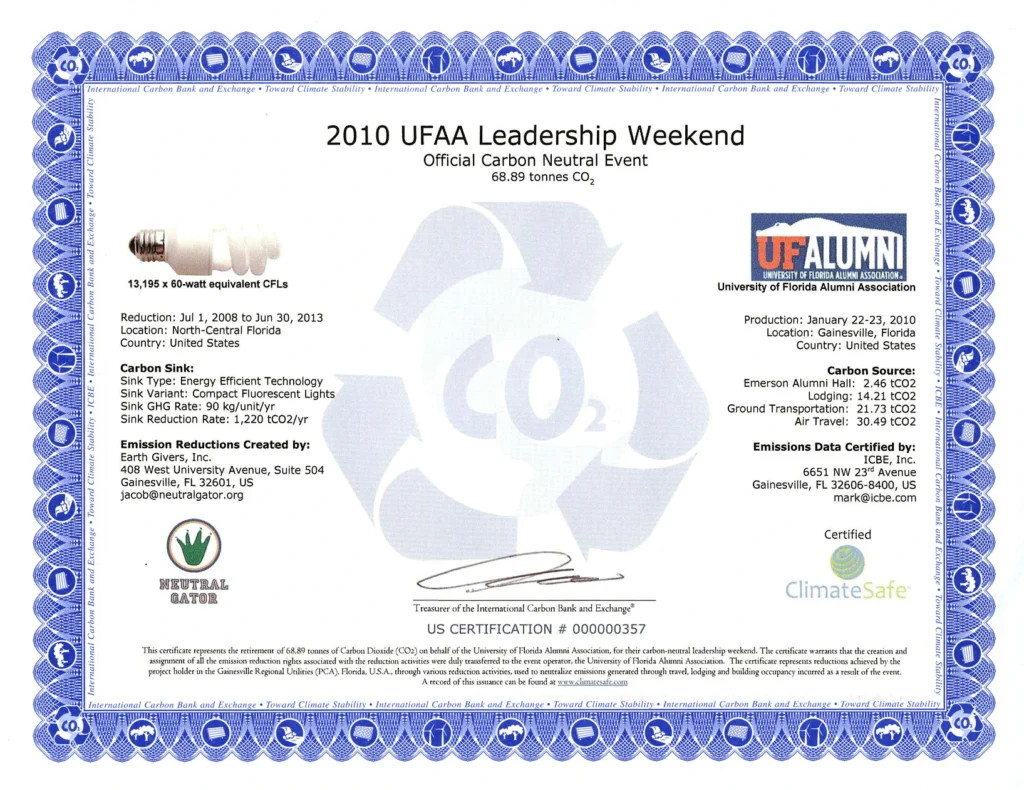 The University of Florida Alumni Association's annual Leadership Weekend was held at Emerson Alumni Hall on the University of Florida campus on January 22-23, 2010. The weekend's events were attended by leadership from Gator Club's across the nation, their friends, family and notable alumni. This was the first carbon neutral event hosted by the UF Alumni Association. Leadership Weekend was made carbon neutral through the purchase of locally generated carbon reductions. These reductions neutralized emissions from ground travel, air travel, hotel room nights and Emerson Alumni Hall.