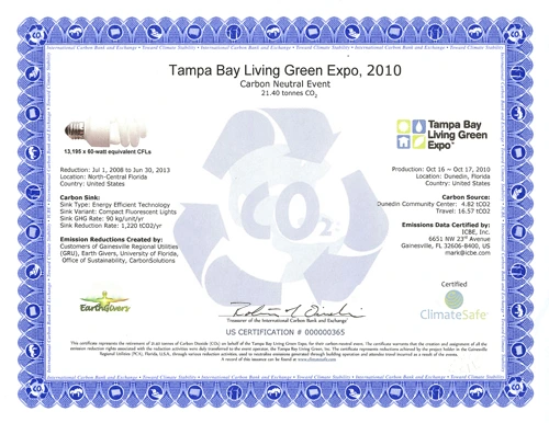 The 2010 Tampa Bay Living Green Expo has been certified carbon neutral by ClimateSafe. Carbon offsets have been provided by Earth Givers, Inc. Tampa Bay Living Green Expo has neutralized emissions resulting from electricity consumption at the Expo venue. Emissions resulting from visitors driving to the Expo have also been offset.
