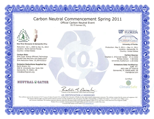 The University of Florida's 233rd graduation ceremony for Spring 2011 was UF's third ever carbon neutral commencement. By purchasing offsets from Earth Givers, Inc., UF neutralized emissions resulting from electricity and water consumption at commencement venues around campus.