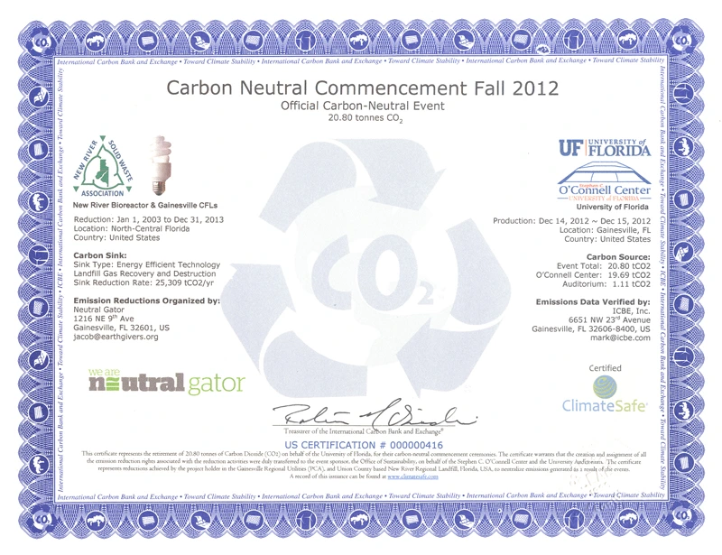 The University of Florida's graduation ceremony for Fall 2012 was UF's sixth carbon-neutral commencement. By partnering with the non-profit Neutral Gator, UF neutralized emissions resulting from water and energy consumption at commencement venues around campus.