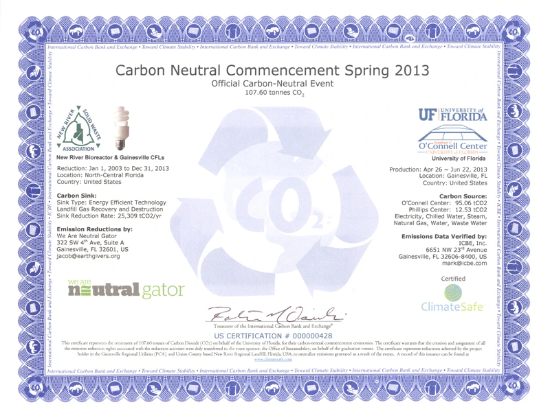 The University of Florida's graduation ceremony for Spring 2013 was UF's seventh carbon-neutral commencement. By partnering with the non-profit We Are Neutral Gator, UF offset emissions resulting from water and energy consumption at commencement venues around campus.