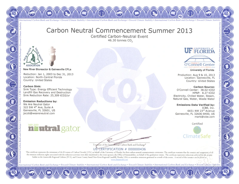 The University of Florida's graduation ceremony for Summer 2013 was UF's eigth carbon-neutral commencement. By partnering with the non-profit We Are Neutral Gator, UF offset emissions resulting from water and energy consumption at commencement venues around campus.