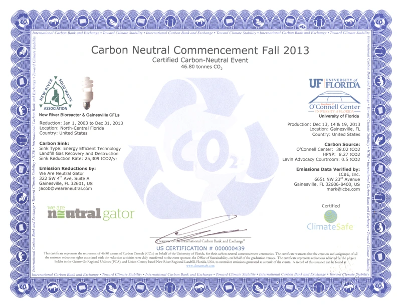The University of Florida's graduation ceremony for Fall 2013 was UF's ninth carbon-neutral commencement. By partnering with the non-profit We Are Neutral Gator, UF offset emissions resulting from water and energy consumption at commencement venues around campus.